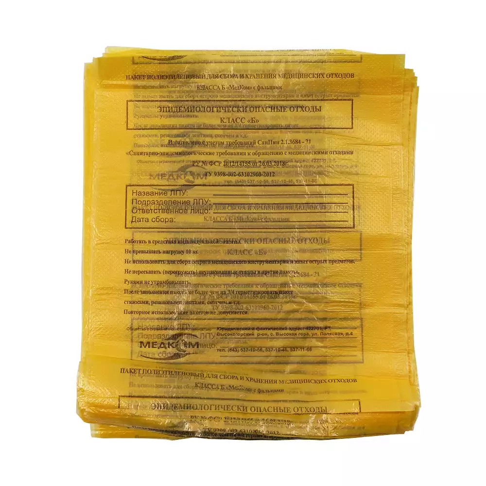Пакет для сбора медицинских отходов, класс Б (желтый), размер 600*1000мм, объем 90-100л, плотность 13 микрон, МедКом НПФ (РОССИЯ), 100 шт