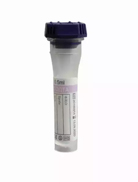 Пробирка невакуумная для капиллярной крови стерильная с ЭДТА-К3 0,5мл, размер 10*45мм, с капилляром, цвет резиновой крышки фиолетовый, 100 штук в штативе, Hebei Xinle Sci&Tech Co Ltd (КИТАЙ), 100 шт
