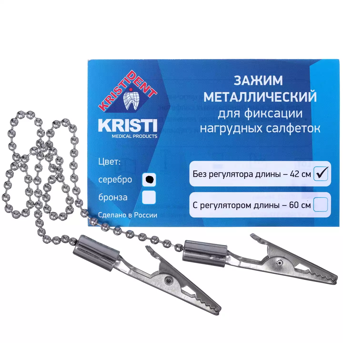 Зажим для нагрудников КРИСТИ одноразовый, с металлической цепочкой 42см, без регулятора длины, Кристи (РОССИЯ)